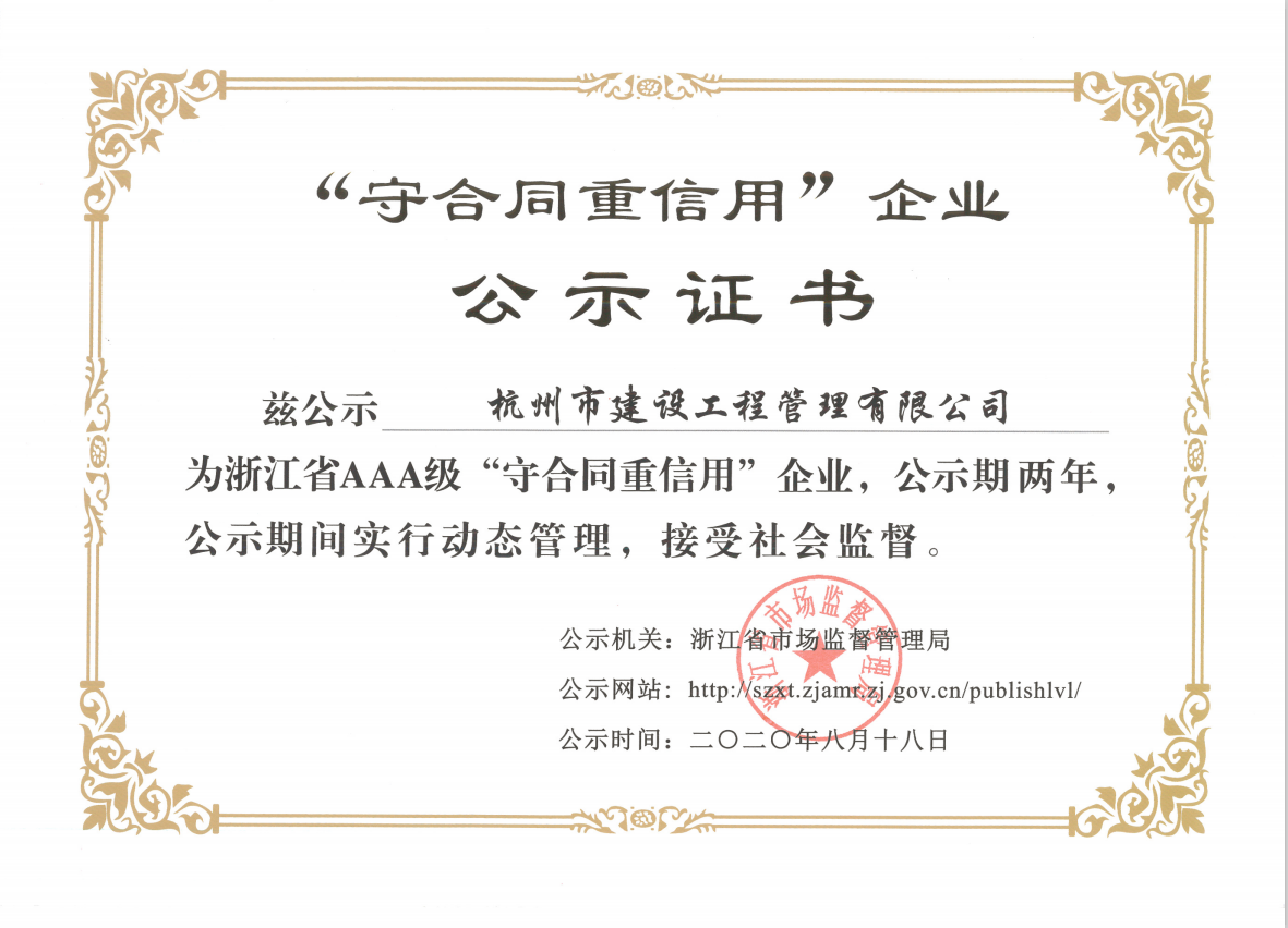 U8平台_U8网页版建设工程管理有限公司荣获2020年浙江省AAA级“守合同重信用”公示证书,不仅证实了杭建“不信不立,不诚不行”一诺千金的企业行为,而且证明了杭建人在砥砺前行的道路上工作井然有序与有条不紊,我们将坚持以严谨的工作态度、实事求是、科学公正的立场,致力于招标代理和造价咨询事业。公司全体员工衷心感谢广大新老客户对公司发展的支持和帮助!